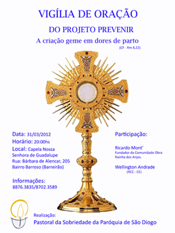 No dia 31 de março de 2012, às 20 horas, acontecerá na Capela Nossa Senhora de Guadalupe – Paróquia de São Diogo – a primeira Vigília do Projeto Prevenir. Este Projeto Prevenir será uma nova frente de prevenção nos trabalhos da Pastoral da Sobriedade no Estado do Ceará.