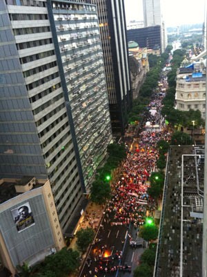 Milhares de pessoas ocupam a Avenida Rio Branco, no Centro do Rio de Janeiro, na tarde desta quarta-feira (20), em protesto coletivo realizado em função da Conferência das Nações Unidas sobre Desenvolvimento Sustentável, a Rio+20. Carros de som, bandeiras, faixas, artistas e até uma escola de samba apoiam as mais variadas causas, em um clima pacífico. Segundo o Centro de Operações Rio, devido aos protestos, a pista lateral da Avenida Presidente Vargas chegou a ter duas faixas interditadas, mas, às 16h35, foi liberada.