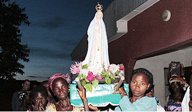 Sem luz elétrica na noite escura, apenas o céu e algumas estrelas, mais de 100 pessoas desfilaram pelos caminhos de Marandallah, na Costa do Marfim, participarando na procissão em honra de Nossa Senhora de Fátima