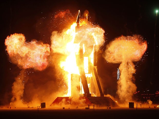 Instalação de madeira com 15,2 metros de altura é incendiada neste sábado (dia 1º) no festival Burning Man, que acontece no deserto Black Rock em Nevada, nos EUA. As chamas fazem parte de uma perfomance do evento de artes e música, que em 2012 chega à sua 26ª edição. (Foto: Jim Urquhart/Reuters)