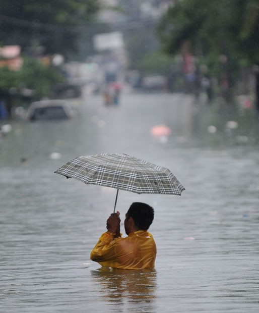 Morador de Manila anda em rua alagada neste sábado