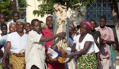 A população da paróquia do Guiúa foi esperar a chegada de Maria Mãe de Deus, junto à sua comunidade mais próxima de Jangamo: Nhaduga. Eis que, ao início da tarde, entre as nuvens de calor e já ao longe se ouviam os cânticos da numerosa delegação da paróquia de Jangamo, que acompanhou em júbilo a imagem peregrina. Esta passou para as mãos dos cristãos do Guiúa e, em comunhão, as duas comunidades acompanharam a Senhora até ao interior da igreja, entoando cânticos a Maria.
